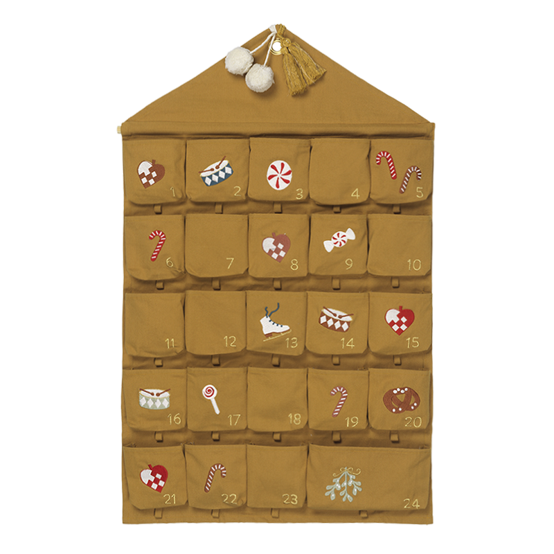 Adventskalender bestickt FABELAB als Wandkalender mit 24 süßen Textiltäschchen für kleine Überraschungen zum Weihnachtsfest. Die Grundfarbe ist Lebkuchenbraun, die Täschchen mit süßen Weihnachtsmotiven bestickt. Das ist ein Weihnachtskalender, den man immer wieder verwenden kann und später mal vererbt