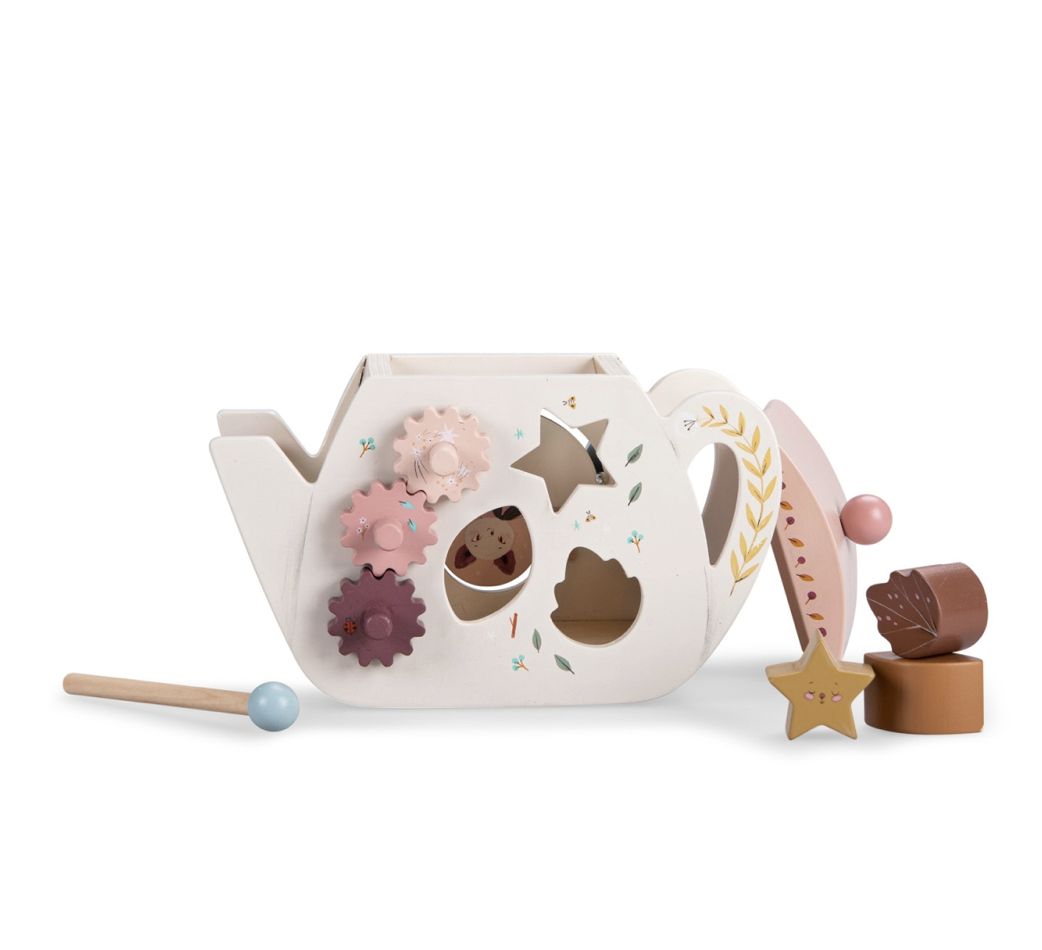 Après la Pluie Aktivitäten Teekanne Moulin Roty aus Holz in schönen Pastellfarben. Hier kann Baby ganz viel entdecken und ausprobieren. Super schönes Babygeschenk. Aktivitätenspielzeug