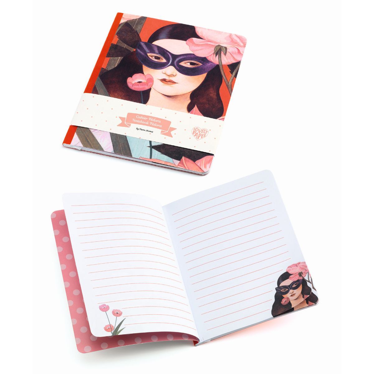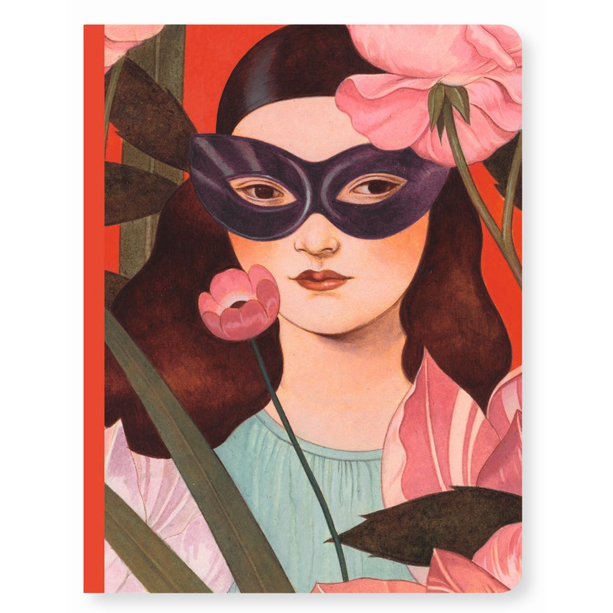 schönes Djeco Notizbuch Fedora in Braun-Orange. Auf der Vorderseite ist ein Mädchen mit schwarzer Maske und Blumen abgebildet. Das Motiv hat metallische, samtene und floureszierende Elemente. Die Ecken sind abgerundet, das Papier ist liniert.