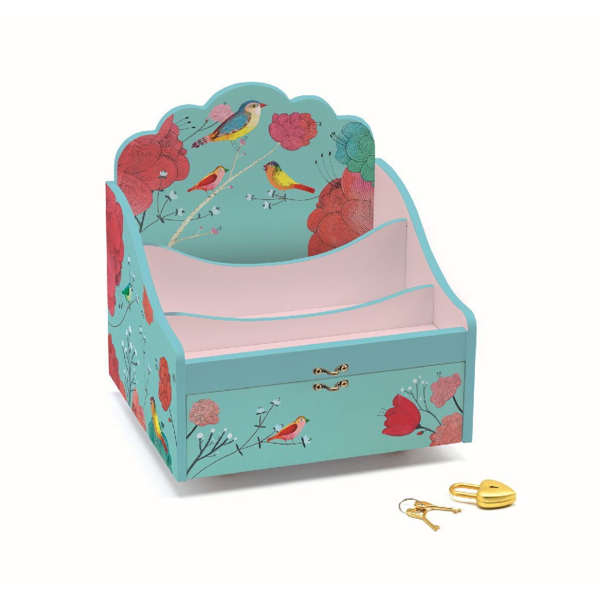 Djeco Schränkchen Blue Secret garden ist ein toller Sekretär für deinen Schreibtisch. Hier kannst du Papier, Sticker, Stifte und kleine Geheimnisse aufbewahren und verschließen (inkl. Schlüssel). Das Design ist wirklich toll in einem hellen aber kräftigen Blau mit dem Vogelmotiv.