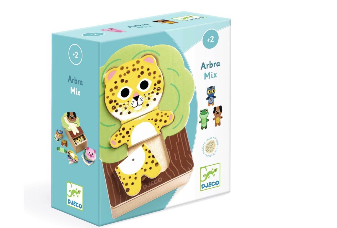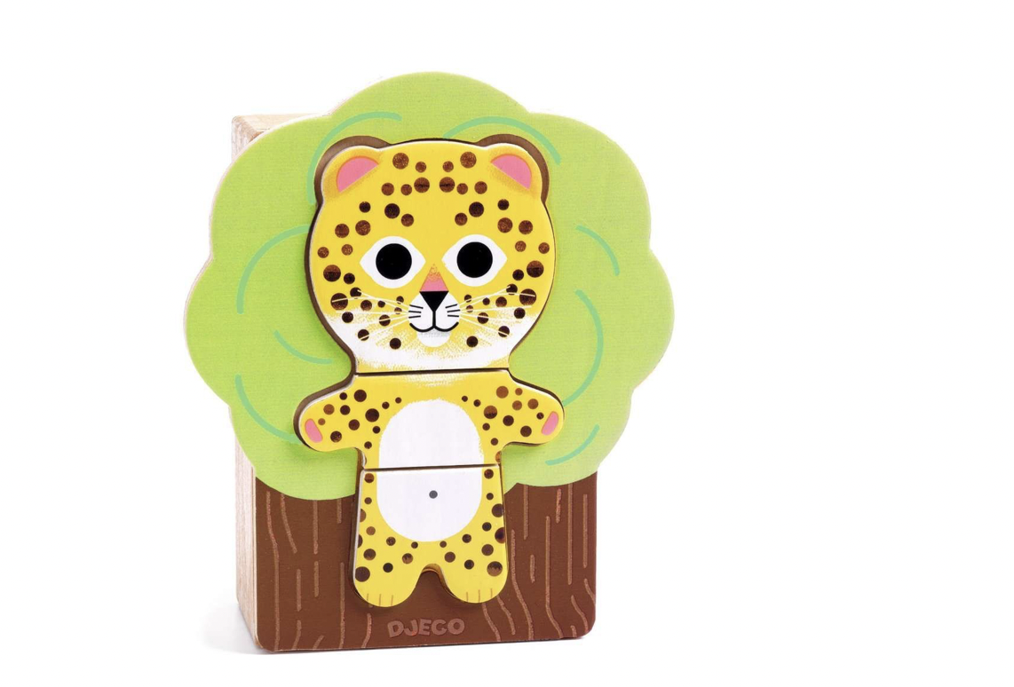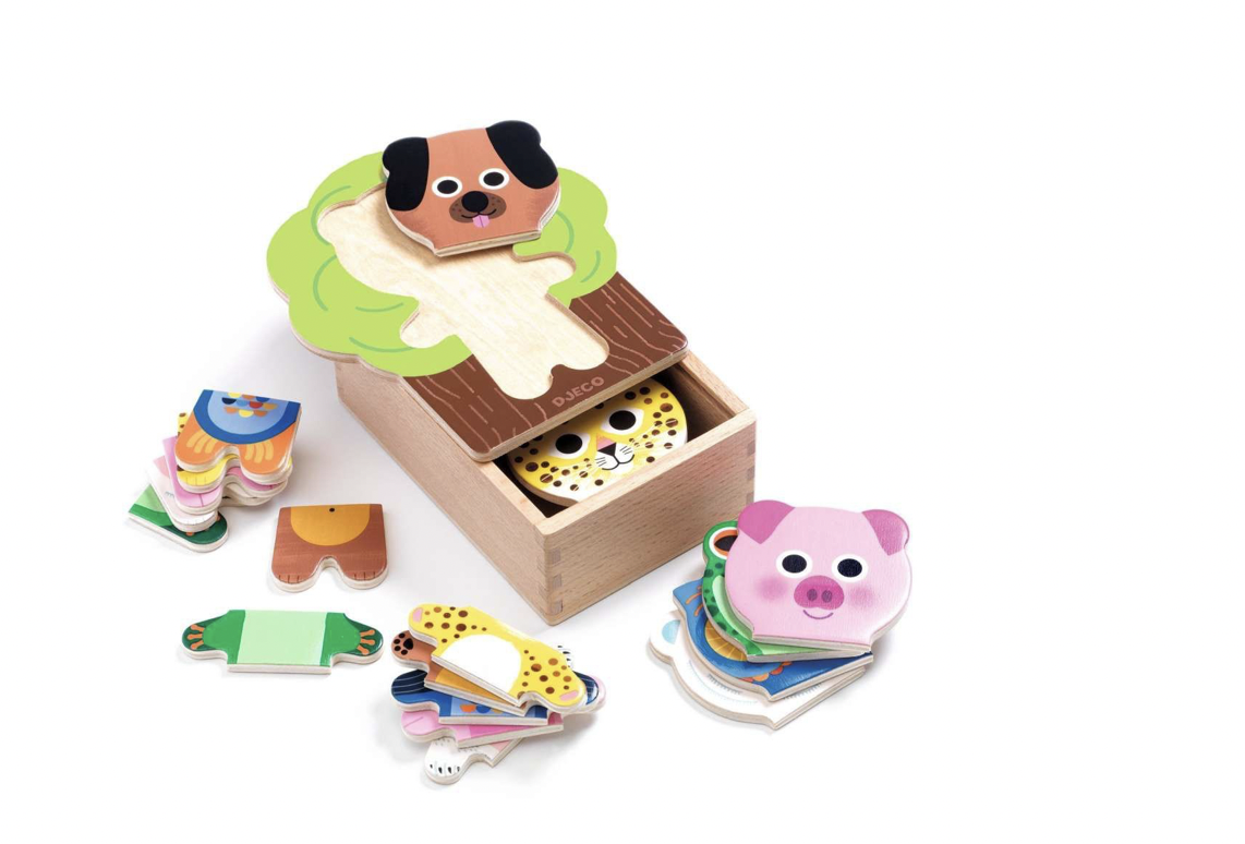 Holzpuzzle Abramix Djeco für Kinder ab 2 Jahren. Das erste Puzzle muss Spaß machen. Und dieses Holzpuzzle macht es definitiv. Abramix von Djeco enthält 6 bunte Tiere, die je aus drei Teilen bestehen und dann kann entweder nach Vorlage gepuzzelt werden oder man erfindet einfach lustige Tiere wie den Froschtiger oder so.