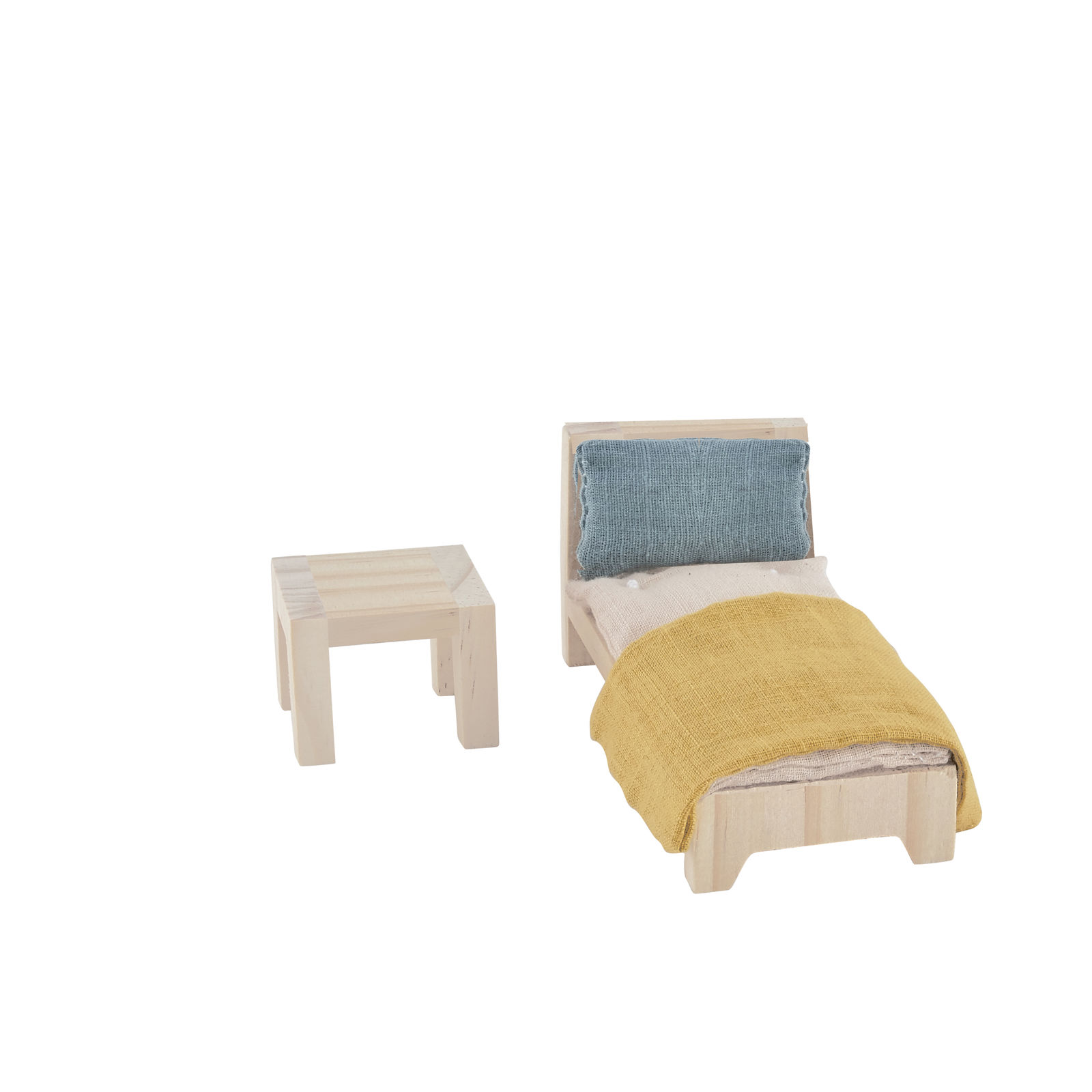 Das Kinderzimmer passend zum Puppenhaus Holdie House von Olli & Ella besteht aus einem schönen Single-Holzbett und Nachttischchen mit einer weißen Leinenmatratze, einem blauen Leinenkissen und einer mustard farbenem Leinendecke. Das Puppenmöbel-Set ist in einer schönen, kleinen Kartonbox verpackt.