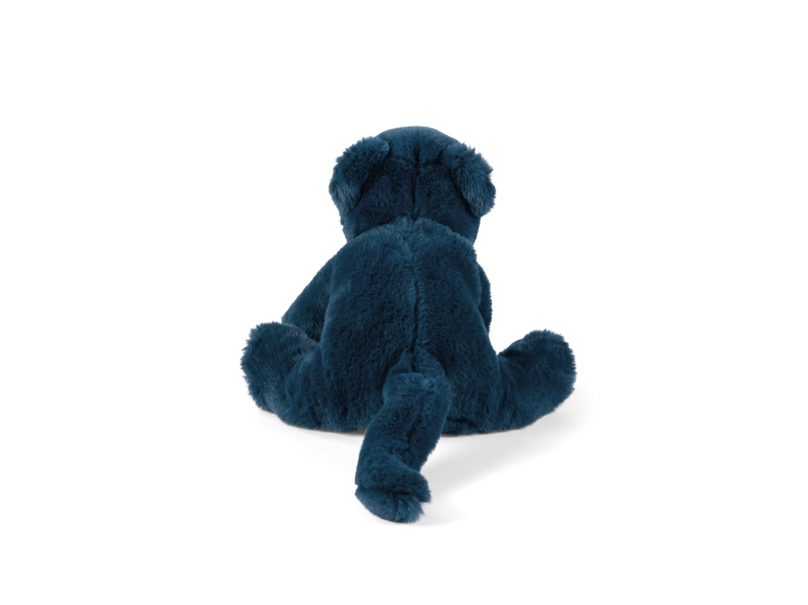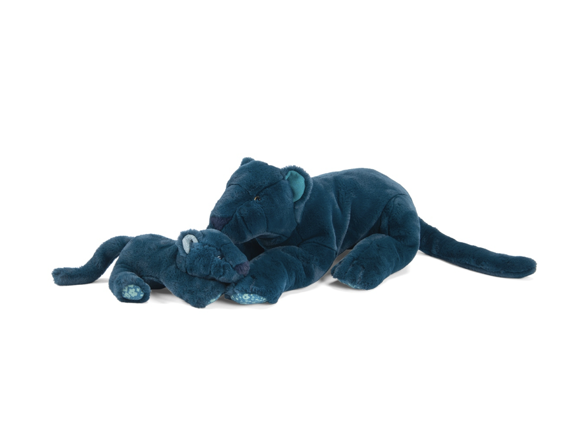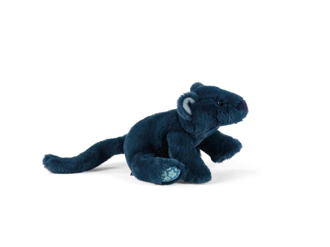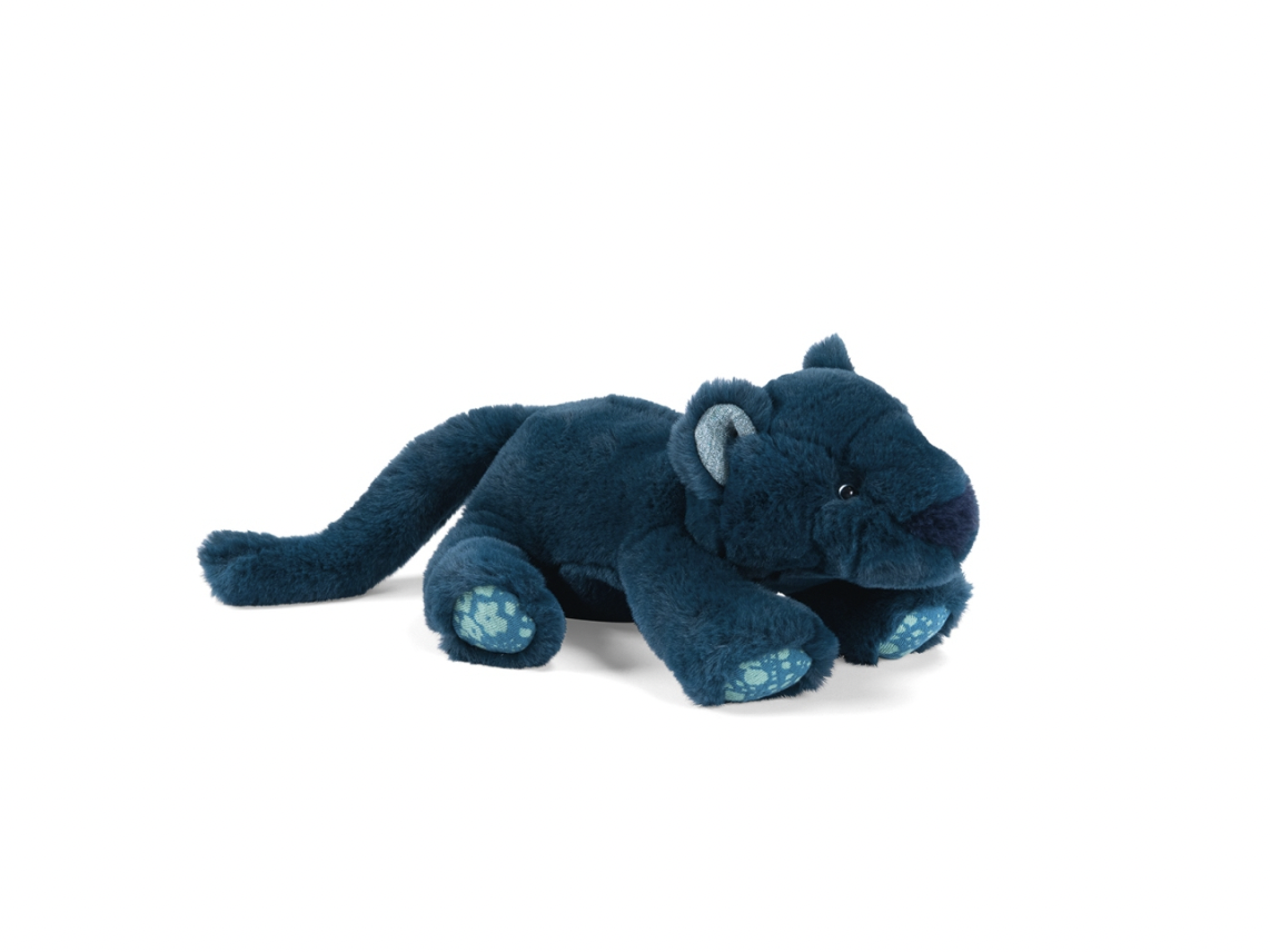Kuscheltier Panther klein Moulin Roty aus dunkel blauem samtigen Plüsch und mit Baumwollstoff abgesetzten Pfötchen. Wunderhübsches kleines Kuscheltier für kleine Mowglis.