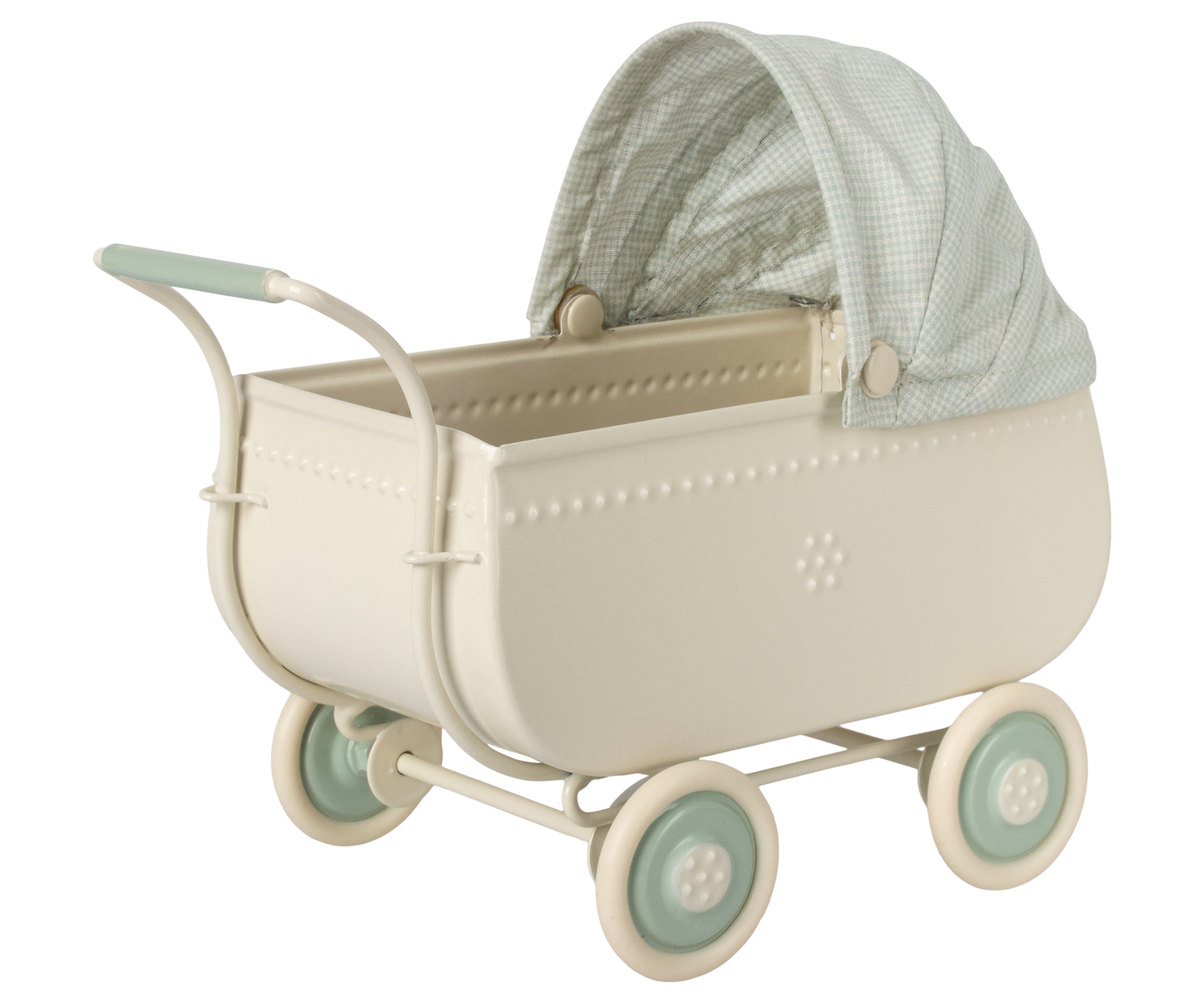 Maileg Puppenwagen blau wunderschön nostalgisch anmutender Puppenwagen aus Metall. Mit abgerundetem Corpus und Griff, Kopfteil aus Textil und verstellbar, sehr elegant, weiß lackiert.