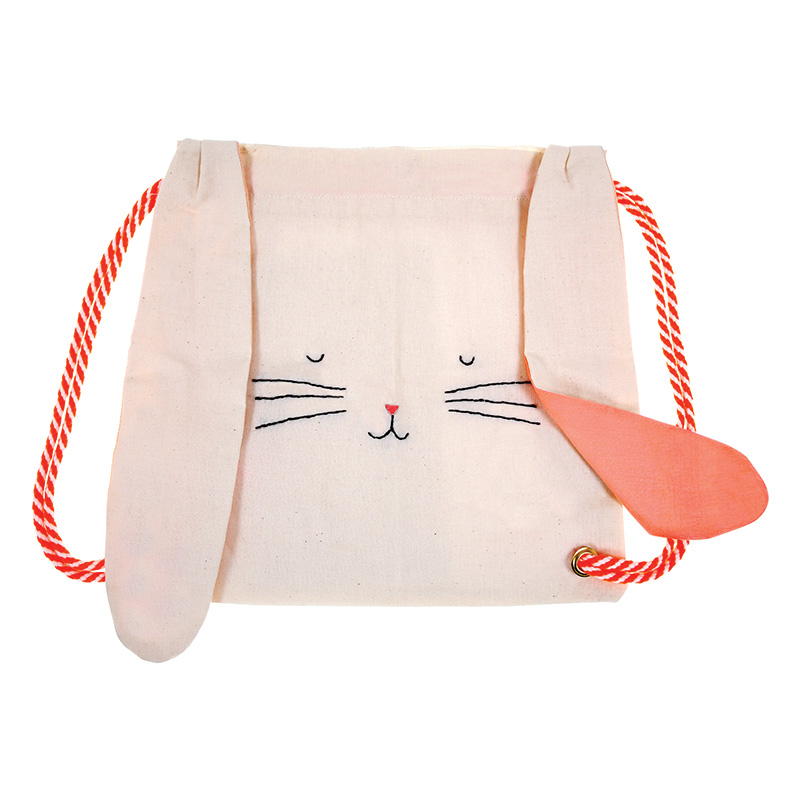 Meri Meri Rucksack Hase ist ein superschnuckeliges Ostergeschenk für Kinder. Der Rucksack ist aus wollweißem Baumwollstoff und lässt sich einfach mit einem Tunnelzugband schließen. Dieses bildet auch gleich die Träger. Wie ein klassicher Turnbeutel eben. An den Seiten sind lange Hasenöhrchen angenäht. Es gibt von Meri Meri auch eine hübsche passende Geldbörse.