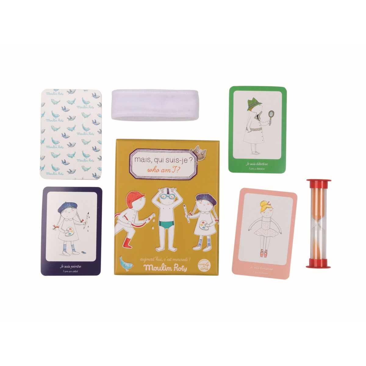 Moulin Roty Spiel Wer bin ich? ist ein süßes Pantomimespiel bei dem es um Beruferaten geht. Es eignet sich auch besonders als Geschenk zum Kindergeburtstag.