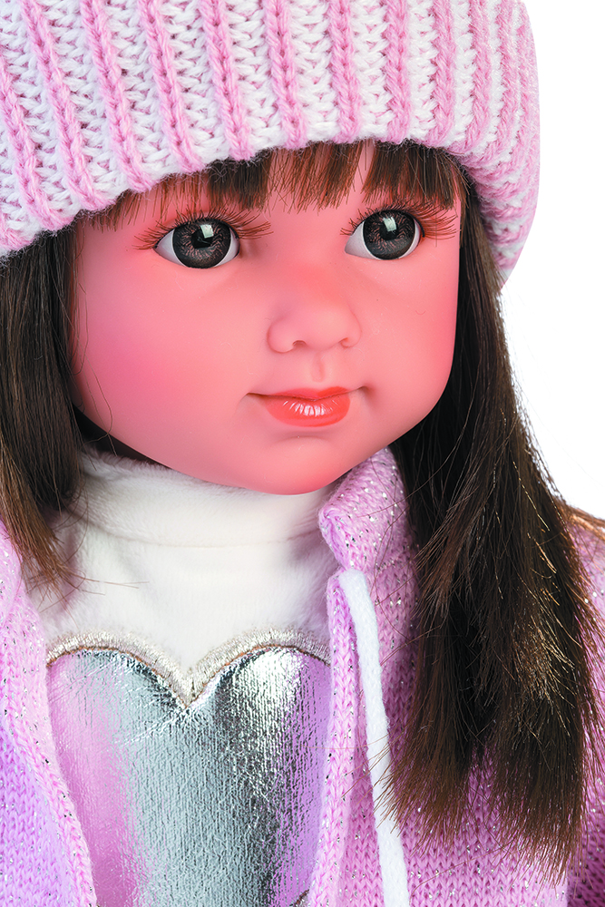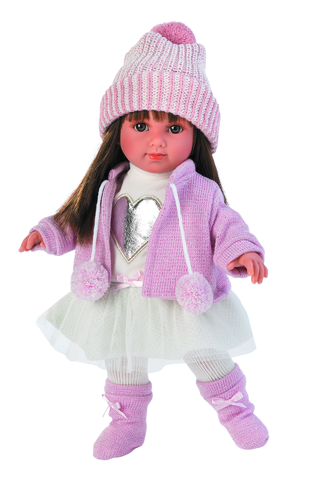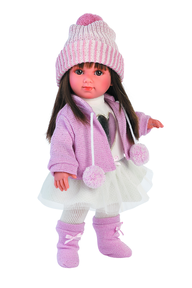 Puppe Sara Llorens ist eine 35cm grosse Fashion Doll mit braunen Augen mit wie echt wirkenden Wimpern, frisierbarem braunem Haar und einem weichem Körper. Kopf, Arme und Beine sind aus Vinyl. Trendiges Outfit bestehend aus Mütze, Strumpfhose, Kapuzenponcho und Söckchen aus pinker Wolle. Die Puppe hat ein hübsches Kleid mit Tüllrock mit aufgenähtem Herz an.