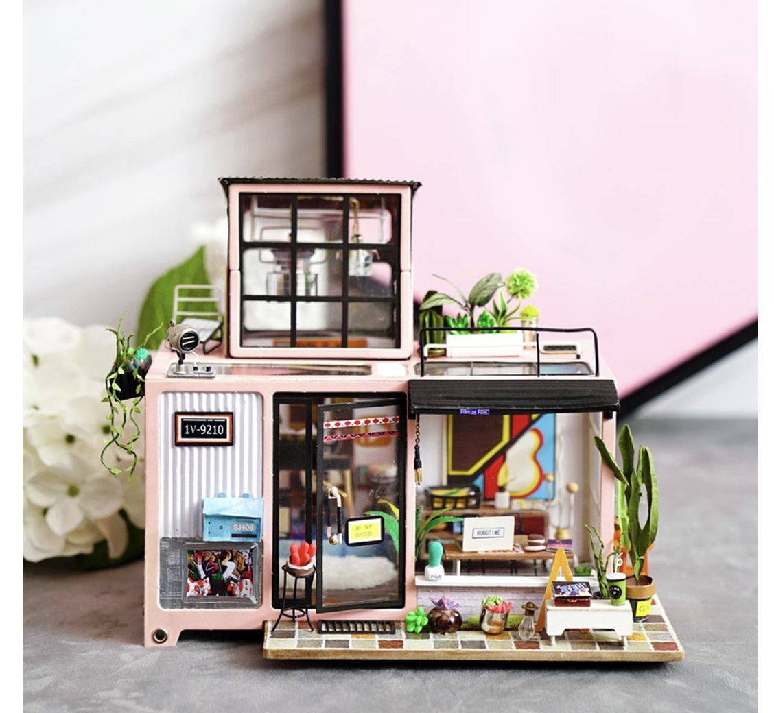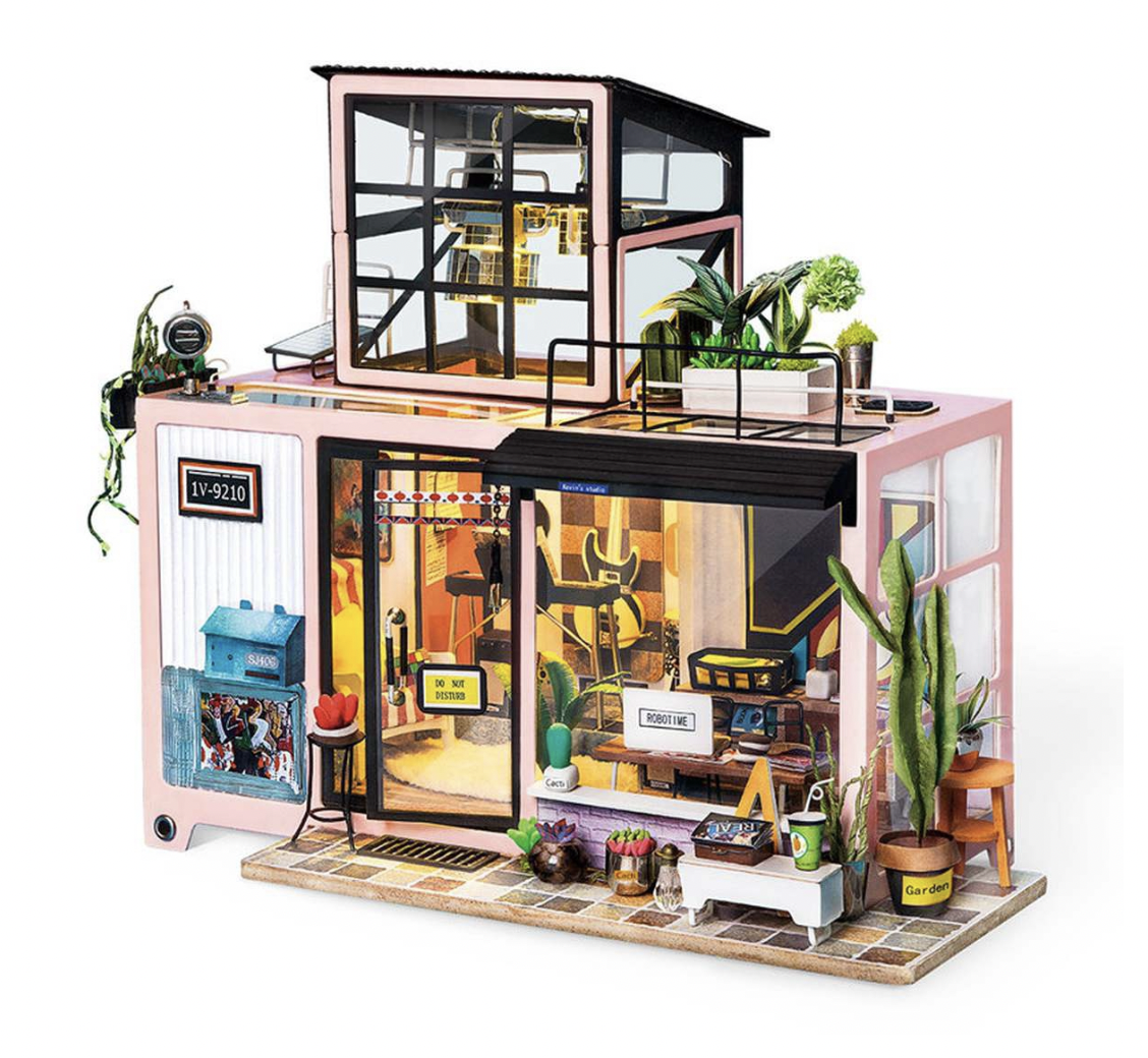 Rolife Kevin's Studio von Robotime. Wunderbarer Modellbausatz für Menschen ab 14 Jahre. Etwas ganz Besonderes für die kalte Jahreszeit. In Kevins Musik-Studio ist alles da, um Musik zu machen, eine Minigitarre, Keyboard, Discolight ...