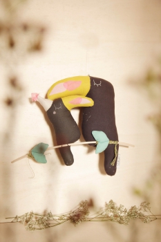 Die wunderschönen Kreationen werden aus ausgewählten Stoffen mit sehr viel Liebe zum Detail gemacht. Der kleine Tukan Charlie und seine Mama sitzen eng aneinandergekuschelt und mit geschlossenen Augen auf ihrem Balserholzast.