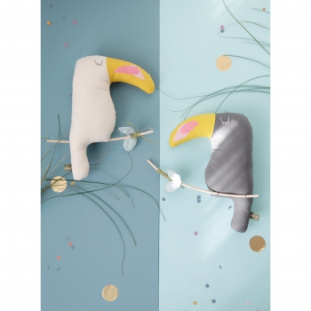 Die wunderschönen Kreationen werden aus ausgewählten Stoffen mit sehr viel Liebe zum Detail gemacht. Der süße cremeweiße Tukan Charlie sitzt schlafend auf einem Balserholzast. An dem Ast sind 2 kleine, hellgrüne Stoffblättern befestigt. Auf seiner Brust sind kleine weiße Fäden eingestickt.