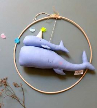 Die wunderschönen Kreationen werden aus ausgewählten Stoffen mit sehr viel Liebe zum Detail gemacht. Dieses Mobilé besteht aus Mama und Babywal in hellgrau. Das Baby sitzt auf dem Rücken der Mutter. Es hat ein kleines, hübsches buntes Hütchen auf. Das Baby hat ein offenes, die Mama ein geschlossenes Auge.