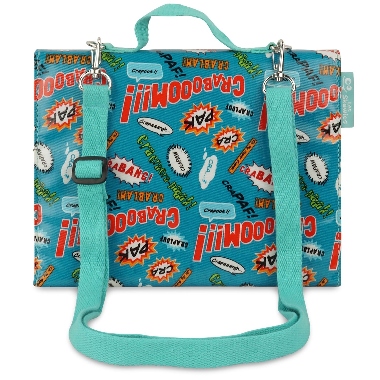 SKEWIES Little Studio Craboom ist ein komplettes Malset zum Mitnehmen und Aufbewahren. Die Tasche lässt sich einfach aufklappen. Im Innenraum gibt es auf der einen Seite eine Verstaumöglichkeit für Stifte und Material, die man mit einem Reißverschluss verschließen kann. Das Zeichenheft ist auf der anderen Seite angebracht (natürlich auswechselbar). So hat man alles immer dabei. Die Tasche kann man wie eine Schultasche am Griff tragen, oder mit dem verstellbaren Schultergurt um die Schulter.