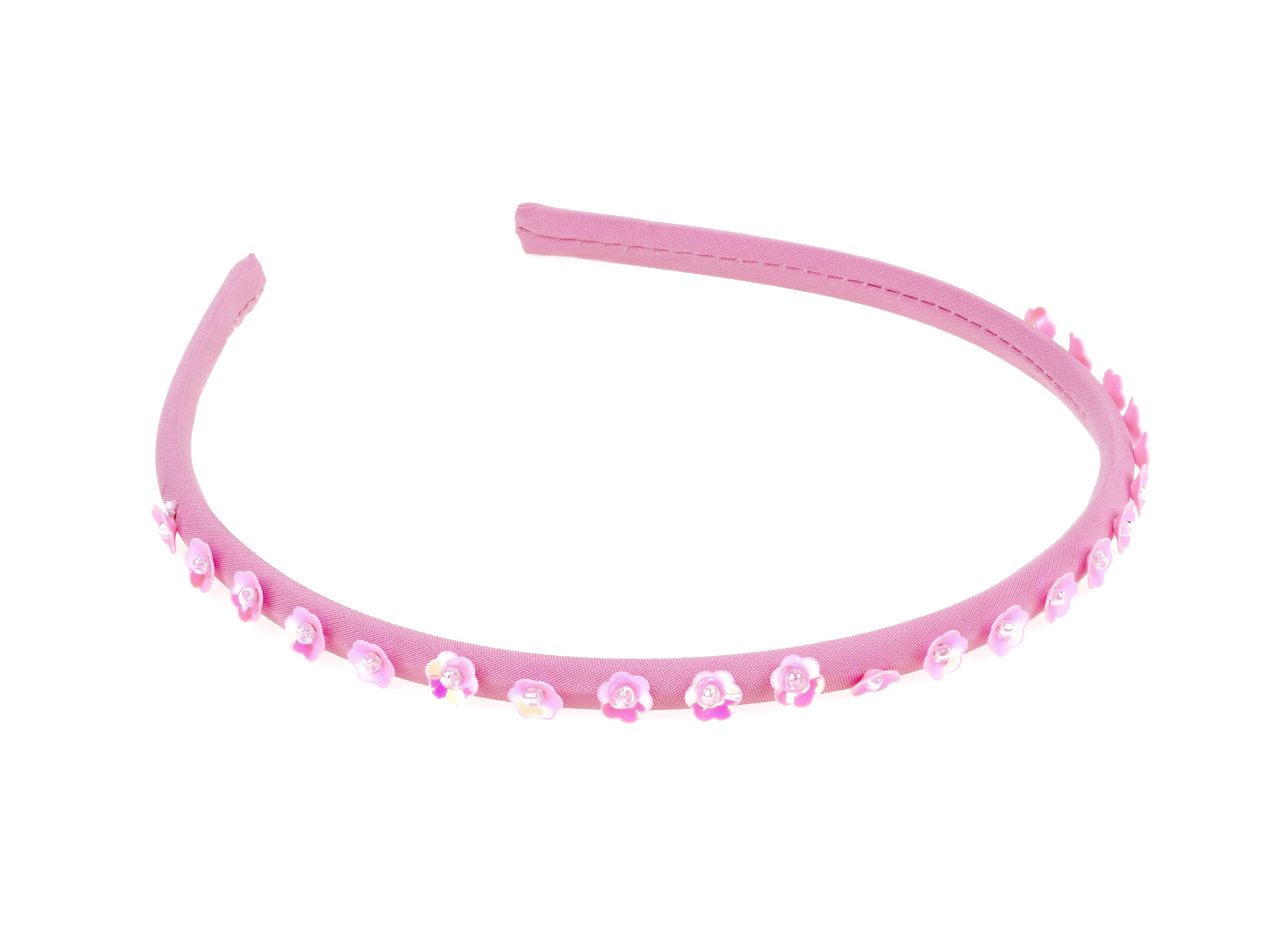 ganz zarter, sehr schmaler, mit kleinem Paillettenblüten verzierter rosa Haarreif