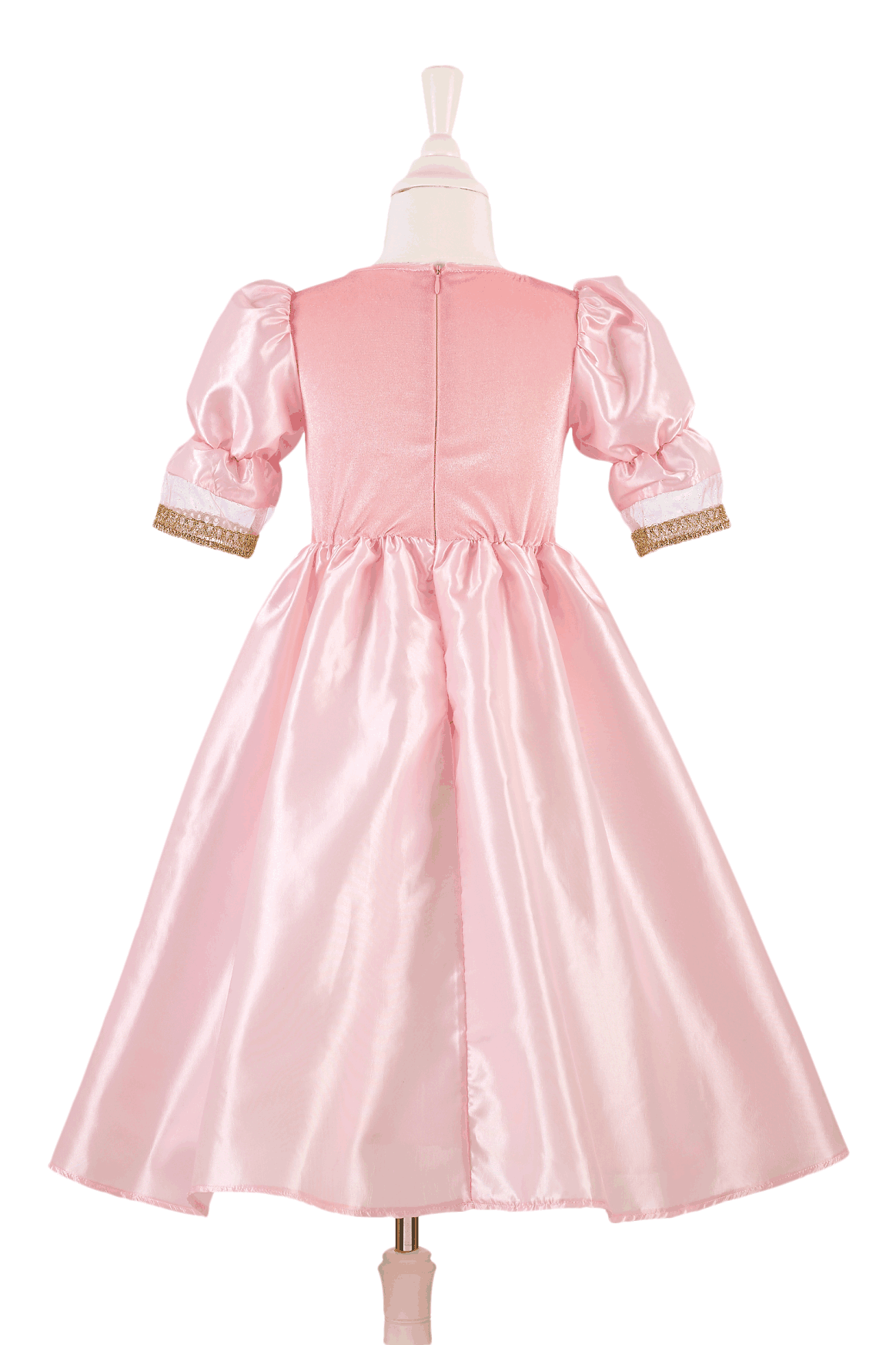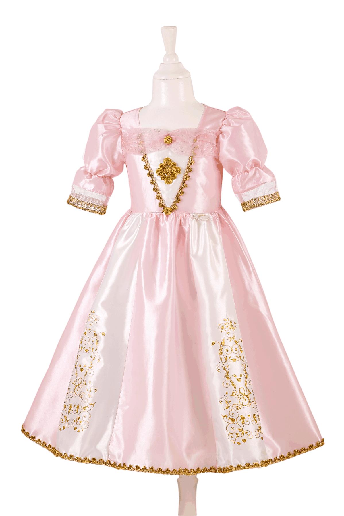 Souza for Kids, das keine Träume offen lässt: es ist rosa und zwar komplett. Die beiden, bis zu 23 cm breiten, mit Goldornamenten verzierten, Zierstreifen am Rock, sind aus einem sehr hellen Rosaton. Das Kleid glänzt insgesamt matt. Besonders gelungen sind die Verzierungen am Brustteil: der dreieckige hellrosa Ziereinsatz ist mit goldenen Blüten bestückt und mit goldenen Ziernähten versehen. Quer darüber, direkt am Halsausschnittverläuft ein golden-transparenter Tüllstreifen. Der Rückenteil ist aus elastischem rosa Samt, so ist es sehr angenehm zu tragen.