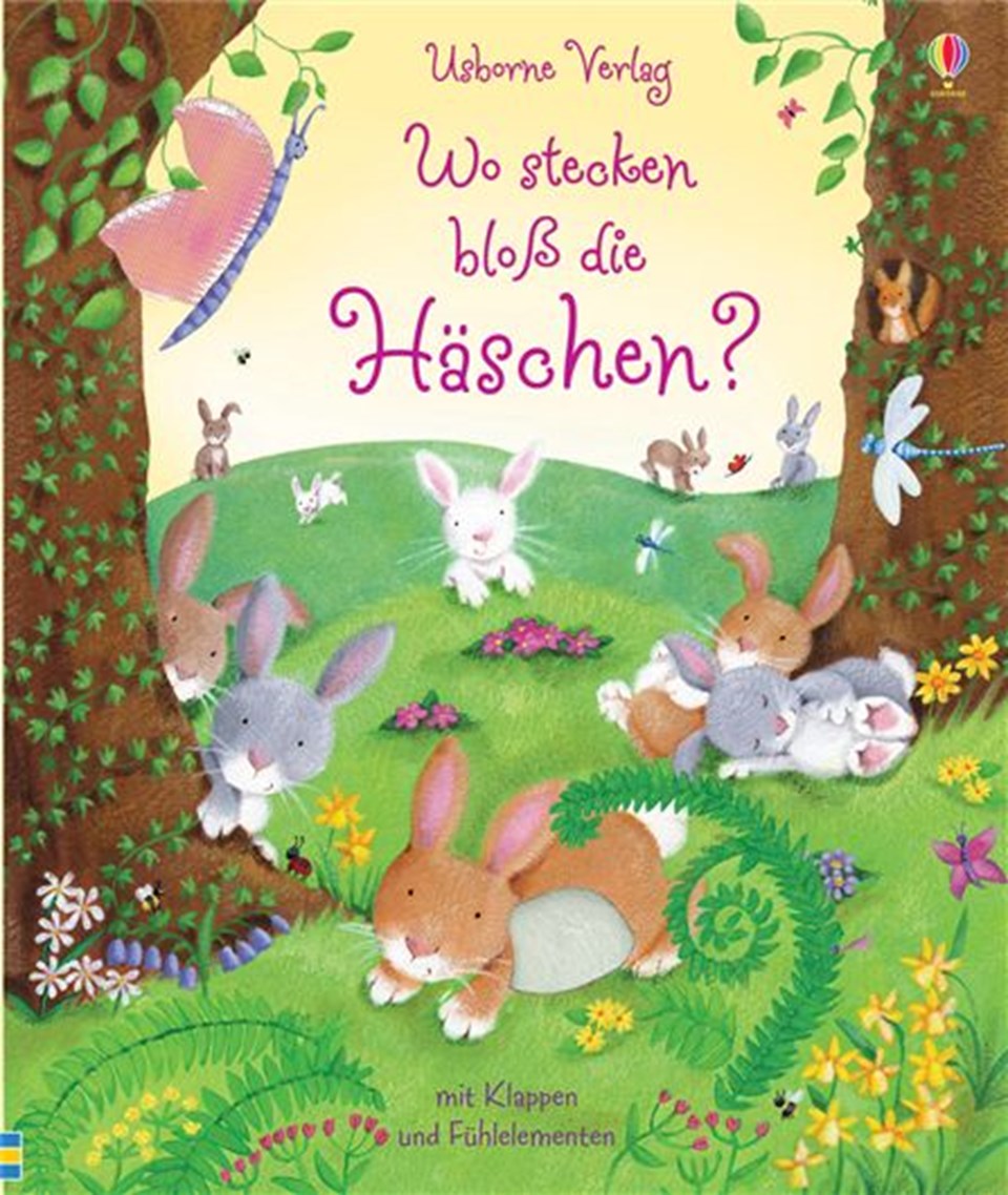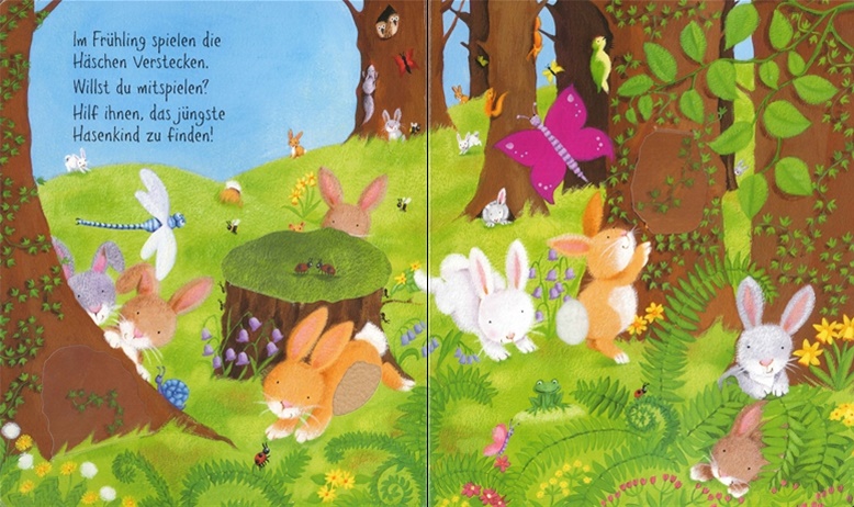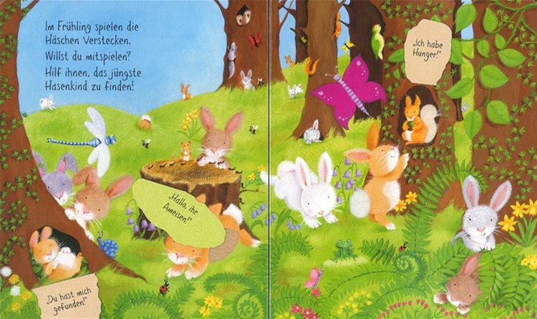 Such und Fühlbuch illustriert von Fiona Watt vom Usborne Verlag. Mit vielen Klappen und Fühlelementen In diesem Buch spielen die Häschen Verstecken, und kleine Kinder können eifrig mitsuchen. Begeistert öffnen sie die Klappen, ertasten verschiedene Materialien und lernen ganz nebenbei die Jahreszeiten, Monate sowie erste Zahlen. Hier gibt es auf jeder Seite viel zu entdecken!